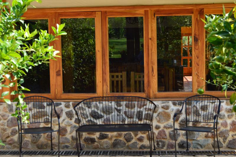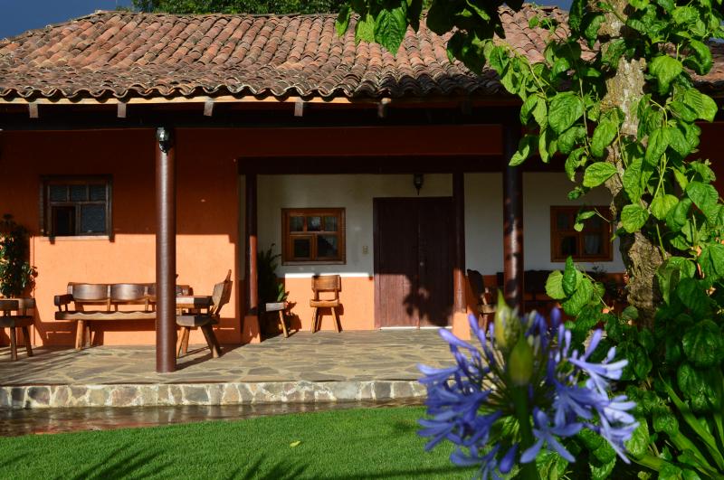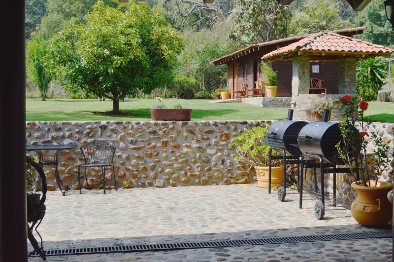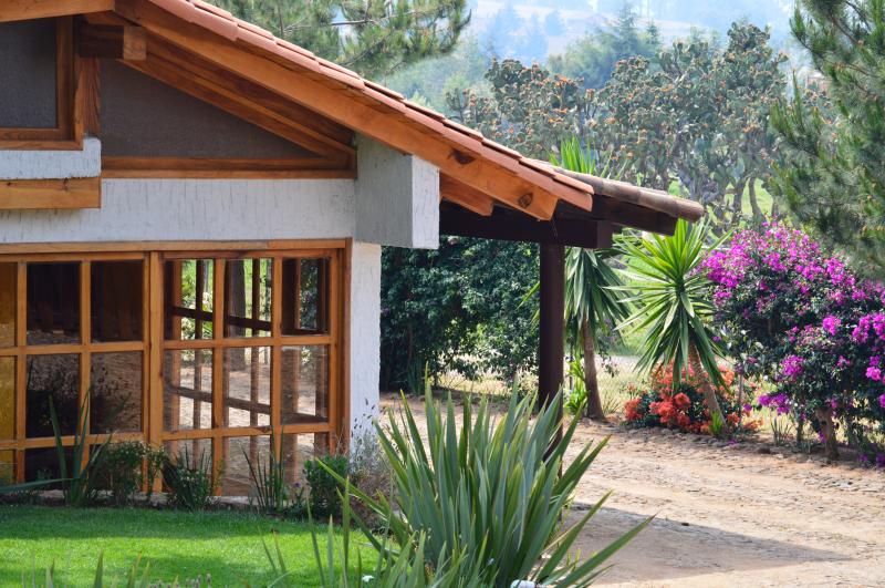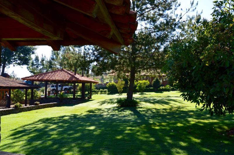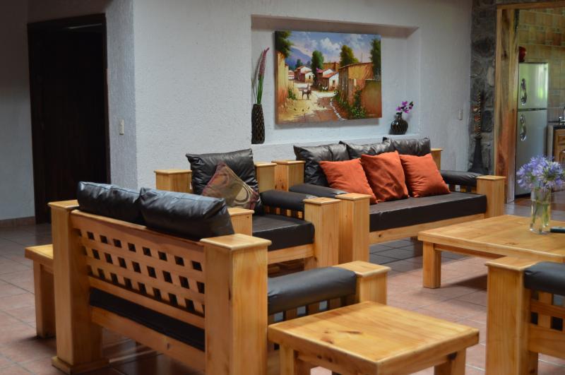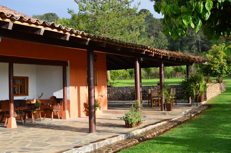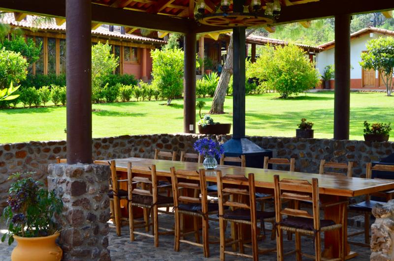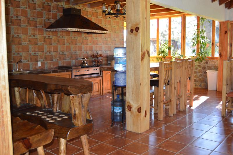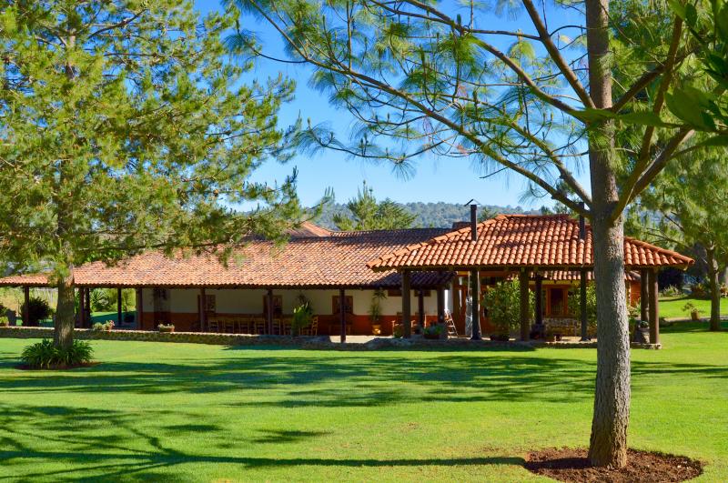 Esta casa de turismo rural dispone de amplios espacios totalmente amueblados con 2 chimeneas. Las 8 recamaras son amplias con todas las comodidades. La casa cuenta con 5 baños completos y 2 medios baños. Capacidad de 10-28 personas cómodamente. Cocina completa para 24 personas, comedor para 18 personas. Amplios jardines y terrazas con 2 chimeneas y 4 baños exteriores. La propiedad y amplio estacionamiento privado es ideal para familias y grupos grandes.